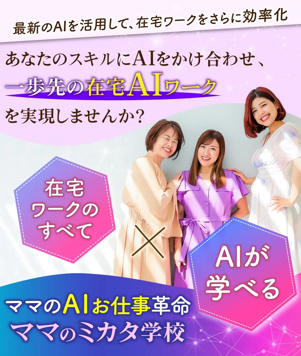 メルカリ、WEBデザイン、在宅セミナー講師、SNS運用、ライティングなどすべての在宅ワークを最先端のAIを活用しながら、効率的に実践することができるので、忙しいママでもスキマ時間で結果がでます。